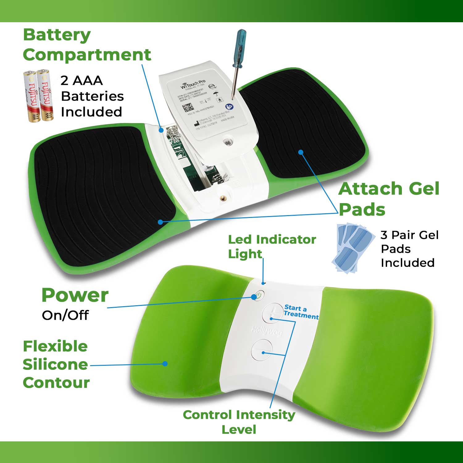 - INCLUDES EVERYTHING YOU NEED TO GET STARTED: You will receive the WiTouch Pro TENS Unit and accessories, including 3 pairs of exclusive Hollywog gel pads, 2 AAA batteries, a mini screwdriver to access the battery compartment, and a quickstart guide; the WiTouch Pro TENS Unit is FSA and/or HSA eligible; do not use this device if you have a cardiac pacemaker, implanted defibrillator or electronic device, or are connected to high frequency surgical equipment