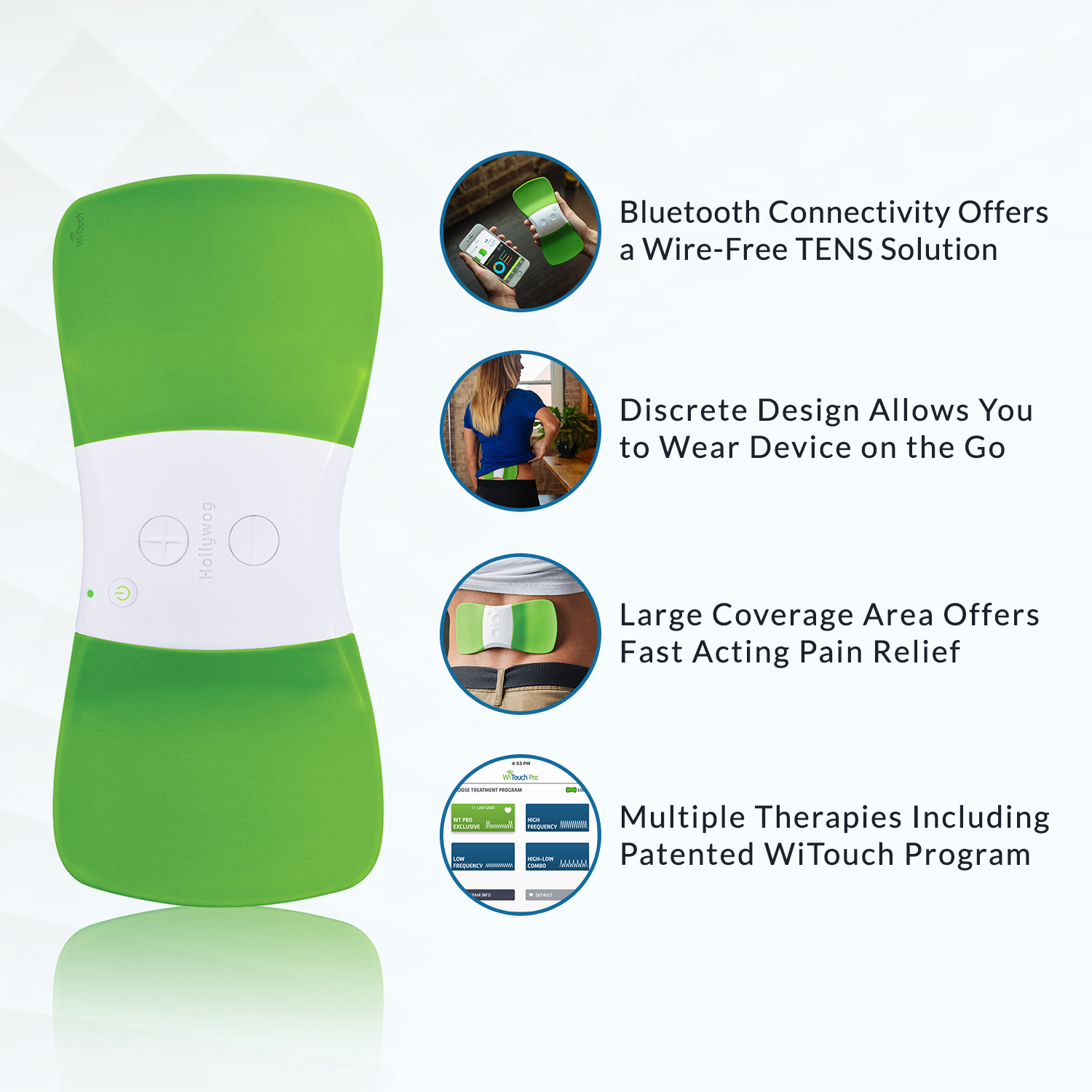 Drug-free relief and management of chronic and acute back pain, sciatica and arthritis; features 4 electro therapy programs, including a patented and exclusive WiTouch Pro treatment program; each program offers 15 levels of intensity, personalized using Bluetooth via your smartphone with the WiTouch Pro app