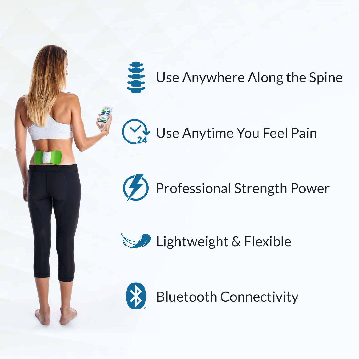 Weighing 4.8 ounces (136 g), the lightweight, minimal design allows the TENS device to be worn discreetly under clothing, contouring perfectly to your back; wireless and non-invasive